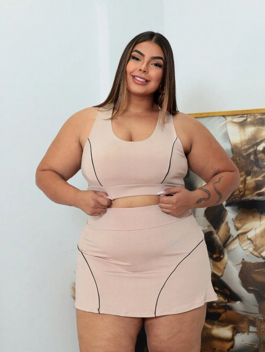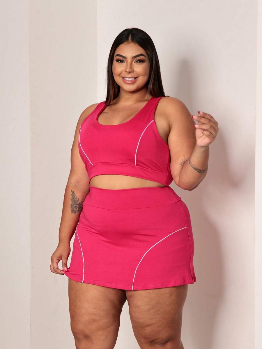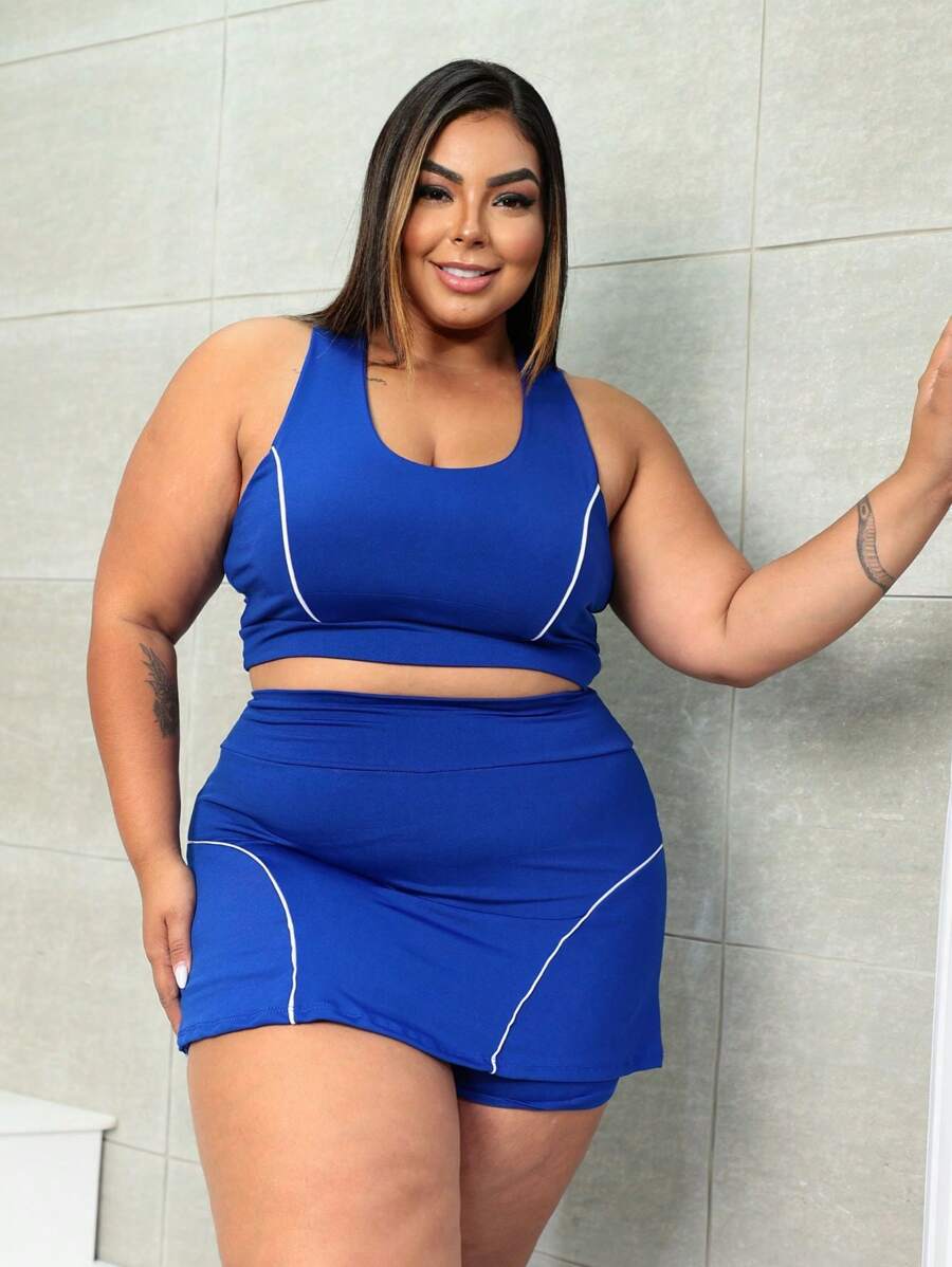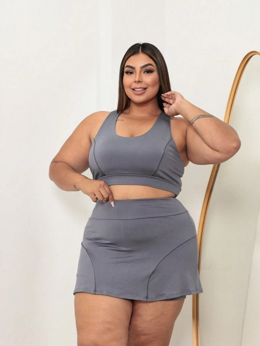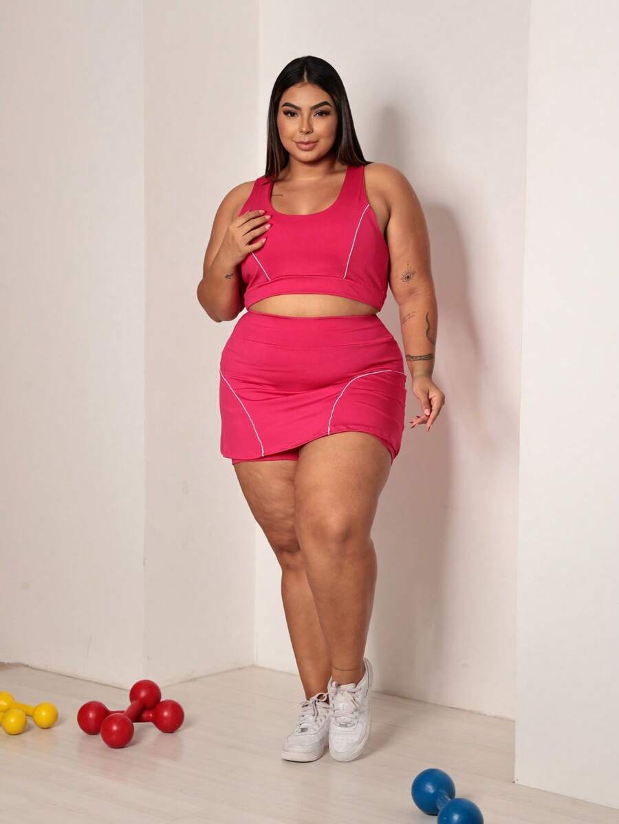 Este conjunto inclui um top e um shorts saia de academia, perfeito para os seus treinos.