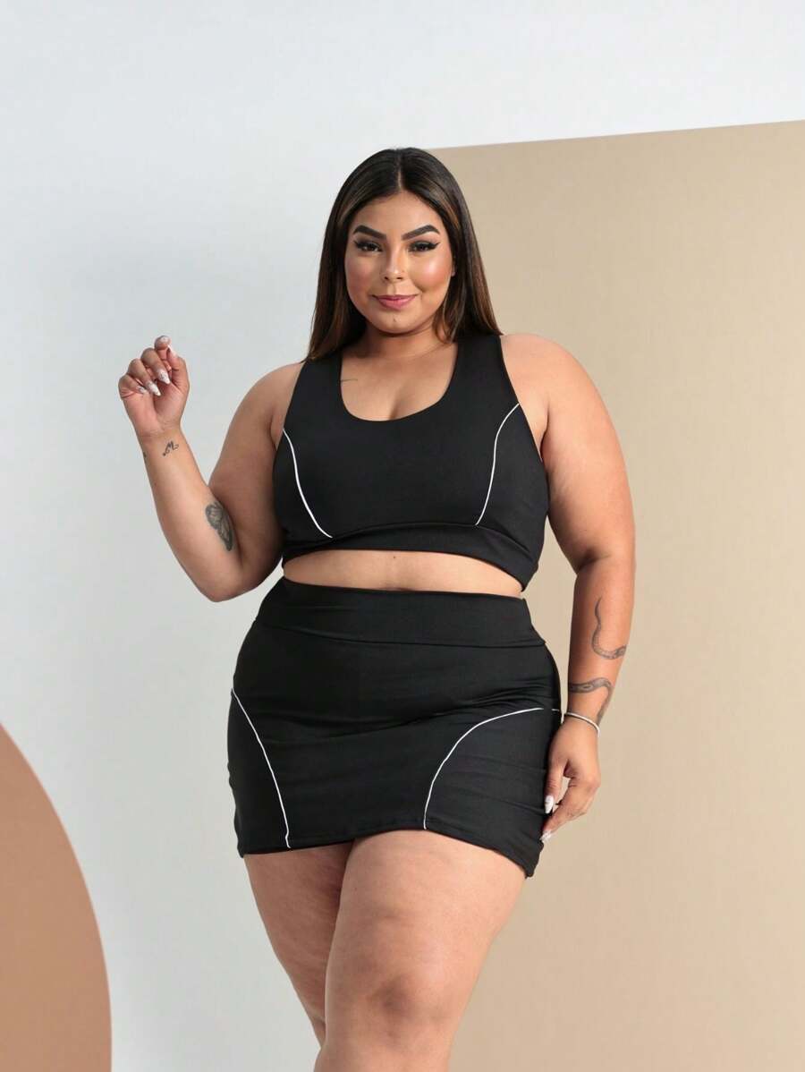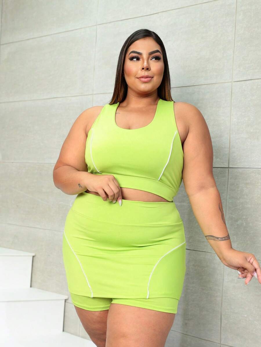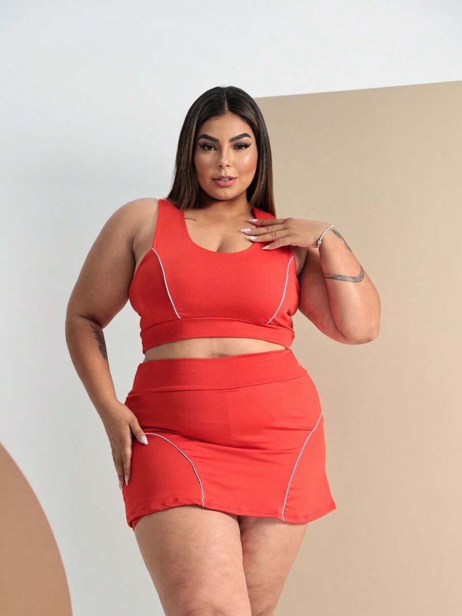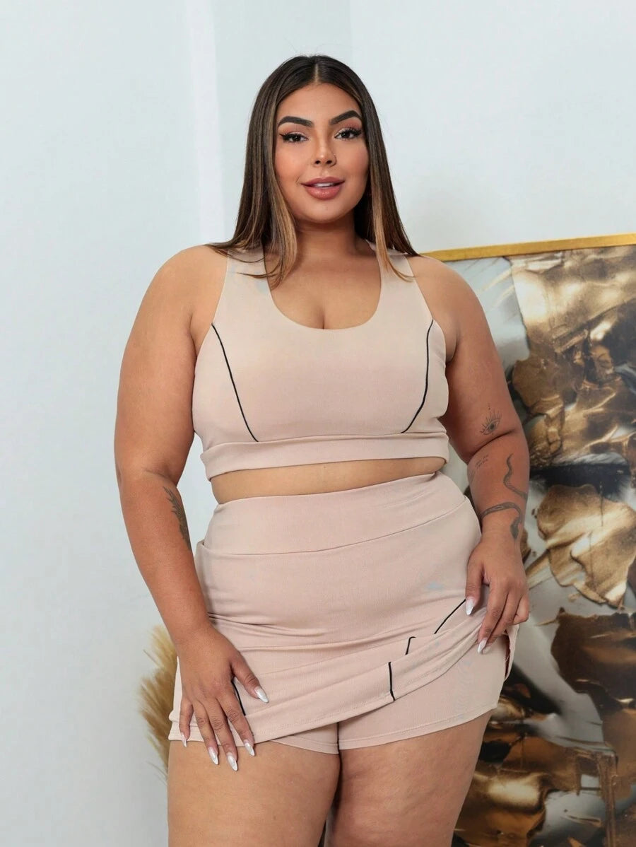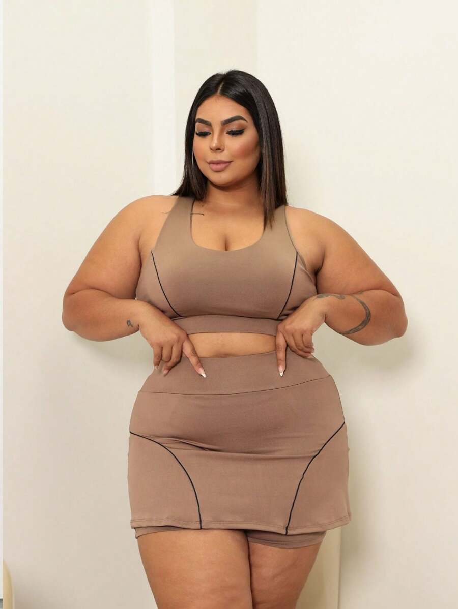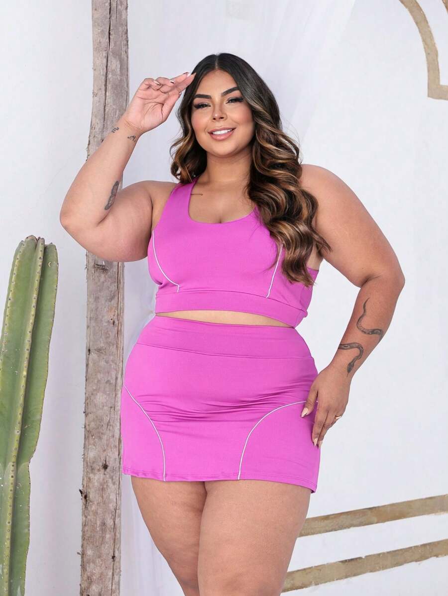 Este conjunto inclui um top e um shorts saia de academia, perfeito para os seus treinos.